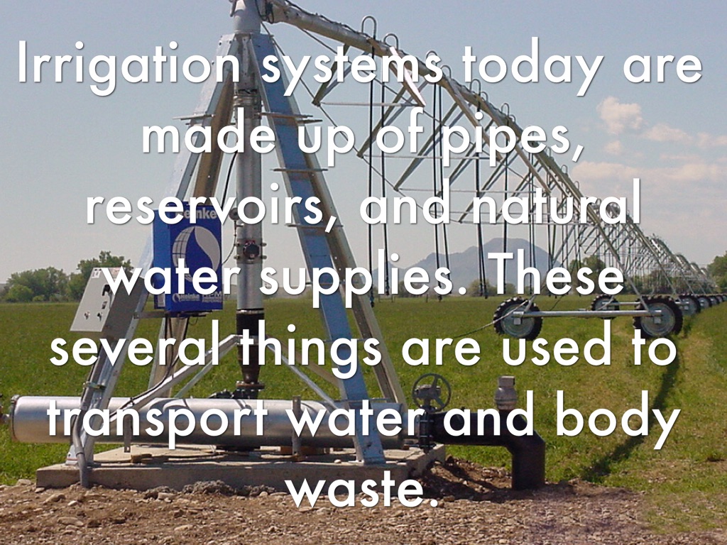 Irrigation systems today are made up of pipes, reservoirs, and natural water supplies. These several things are used to transport water and body waste.