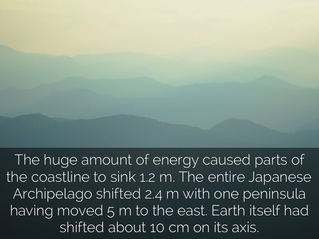 The huge amount of energy caused parts of the coastline to sink 1.2 m. The entire Japanese Archipelago shifted 2.4 m with one peninsula having moved 5 m to the east. Earth itself had shifted about 10 cm on its axis.