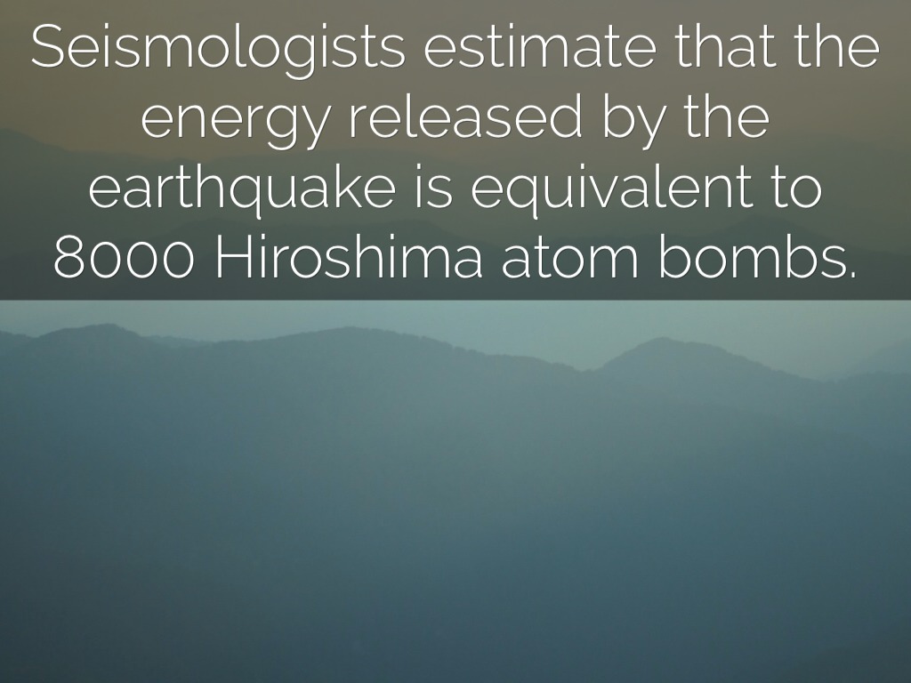Seismologists estimate that the energy released by the earthquake is equivalent to 8000 Hiroshima atom bombs.