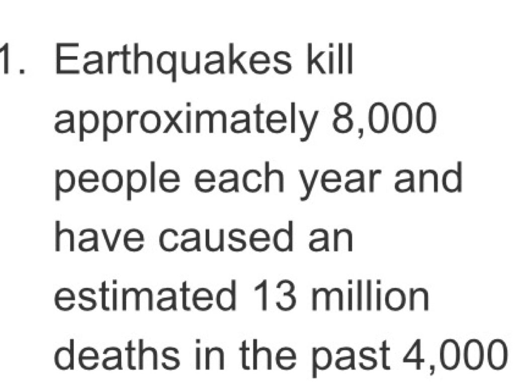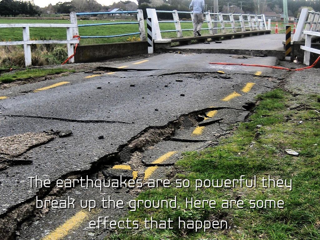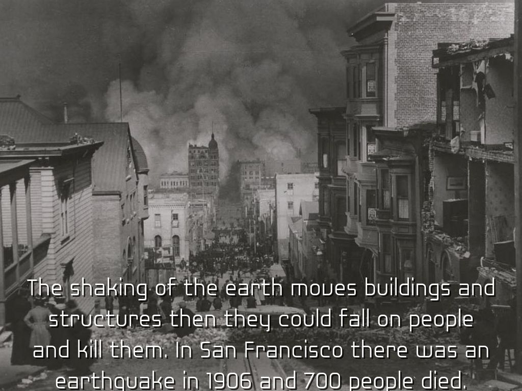 The shaking of the earth moves buildings and structures then they could fall on people and kill them. In San Francisco there was an earthquake in 1906 and 700 people died.