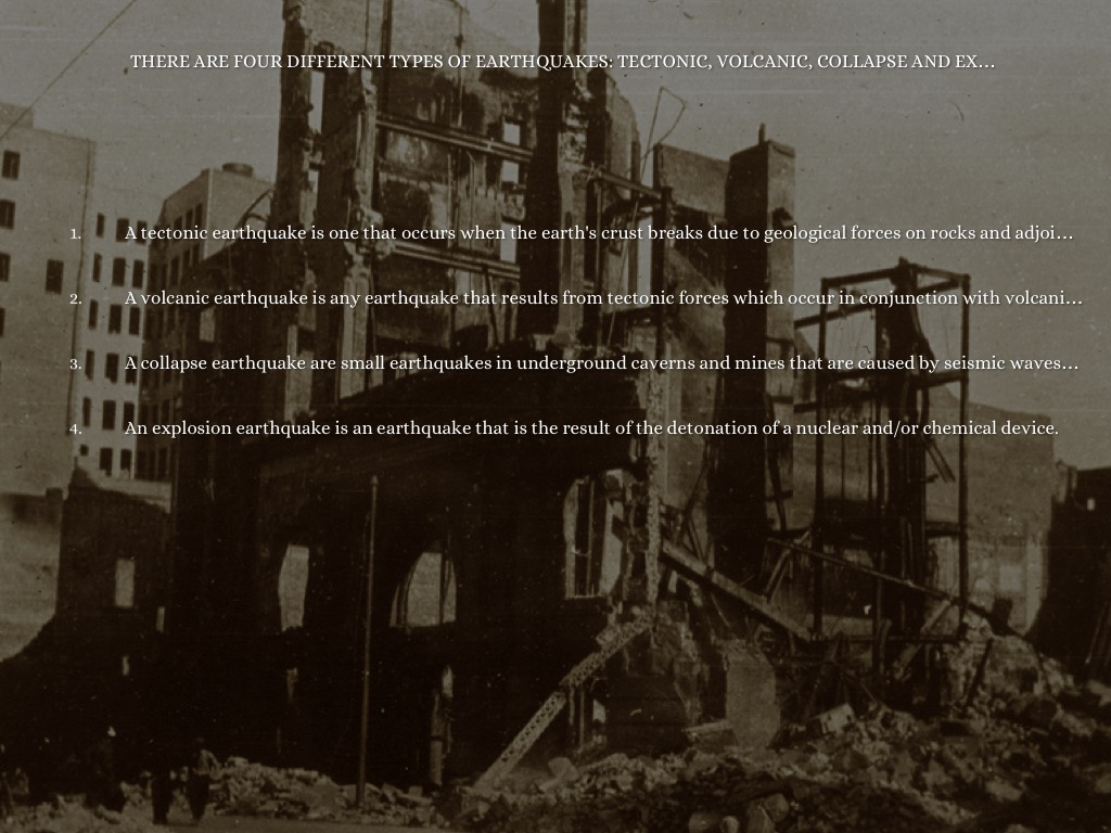There are four different types of earthquakes: Tectonic, volcanic, collapse and explosion.