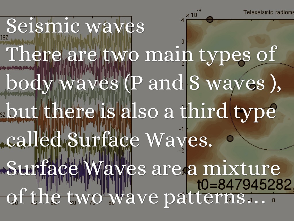 Seismic waves There are two main types of body waves (P and S waves ), but there is also a third type called Surface Waves. Surface Waves are a mixture of the two wave patterns together.