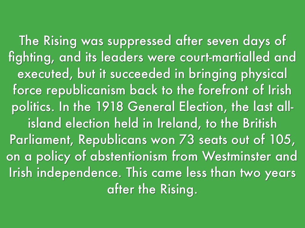 The Rising was suppressed after seven days of fighting, and its leaders were court-martialled and executed, but it succeeded in bringing physical force republicanism back to the forefront of Irish politics. In the 1918 General Election, the last all-island election held in Ireland, to the British Parliament, Republicans won 73 seats out of 105, on a policy of abstentionism from Westminster and Irish independence. This came less than two years after the Rising.