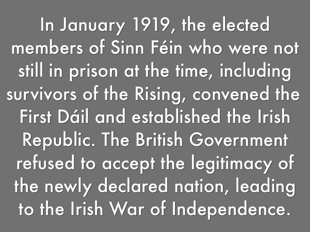 In January 1919, the elected members of Sinn Féin who were not still in prison at the time, including survivors of the Rising, convened the First Dáil and established the Irish Republic. The British Government refused to accept the legitimacy of the newly declared nation, leading to the Irish War of Independence.