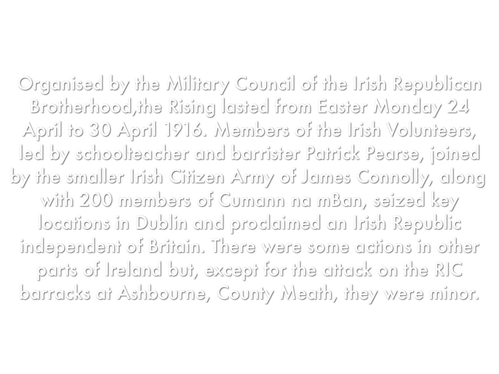 Organised by the Military Council of the Irish Republican Brotherhood,the Rising lasted from Easter Monday 24 April to 30 April 1916. Members of the Irish Volunteers, led by schoolteacher and barrister Patrick Pearse, joined by the smaller Irish Citizen Army of James Connolly, along with 200 members of Cumann na mBan, seized key locations in Dublin and proclaimed an Irish Republic independent of Britain. There were some actions in other parts of Ireland but, except for the attack on the RIC barracks at Ashbourne, County Meath, they were minor.