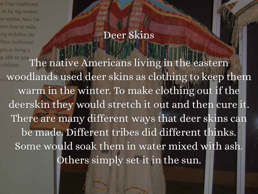 The native Americans living in the eastern woodlands used deer skins as clothing to keep them warm in the winter. To make clothing out if the deerskin they would stretch it out and then cure it. There are many different ways that deer skins can be made. Different tribes did different thinks. Some would soak them in water mixed with ash. Others simply set it in the sun.