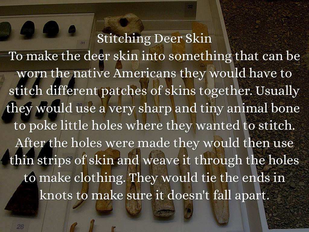 Stitching Deer Skin To make the deer skin into something that can be worn the native Americans they would have to stitch different patches of skins together. Usually they would use a very sharp and tiny animal bone to poke little holes where they wanted to stitch. After the holes were made they would then use thin strips of skin and weave it through the holes to make clothing. They would tie the ends in knots to make sure it doesn't fall apart.