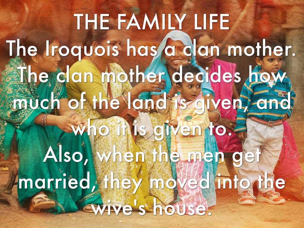 The Iroquois has a clan mother. The clan mother decides how much of the land is given, and who it is given to.