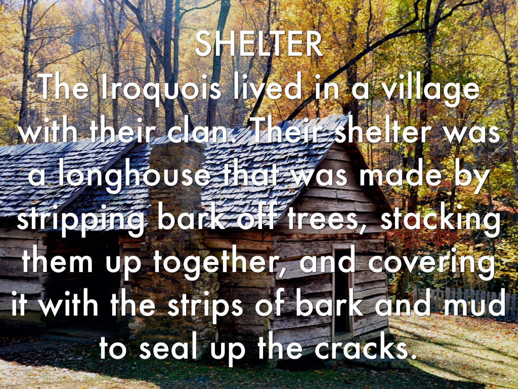 The Iroquois lived in a village with their clan. Their shelter was a longhouse that was made by stripping bark off trees, stacking them up together, and covering it with the strips of bark and mud to seal up the cracks.