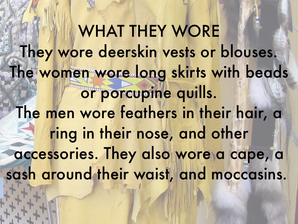 The men wore feathers in their hair, a ring in their nose, and other accessories. They also wore a cape, a sash around their waist, and moccasins.