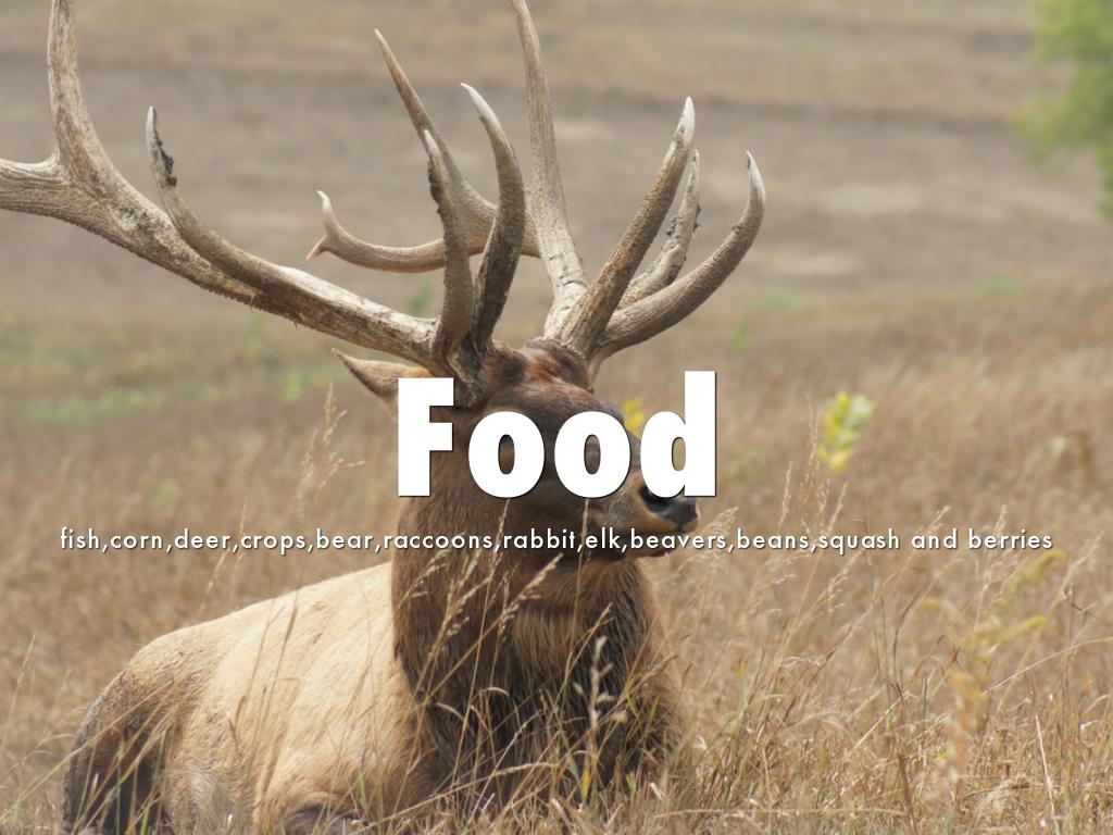 fish,corn,deer,crops,bear,raccoons,rabbit,elk,beavers,beans,squash and berries