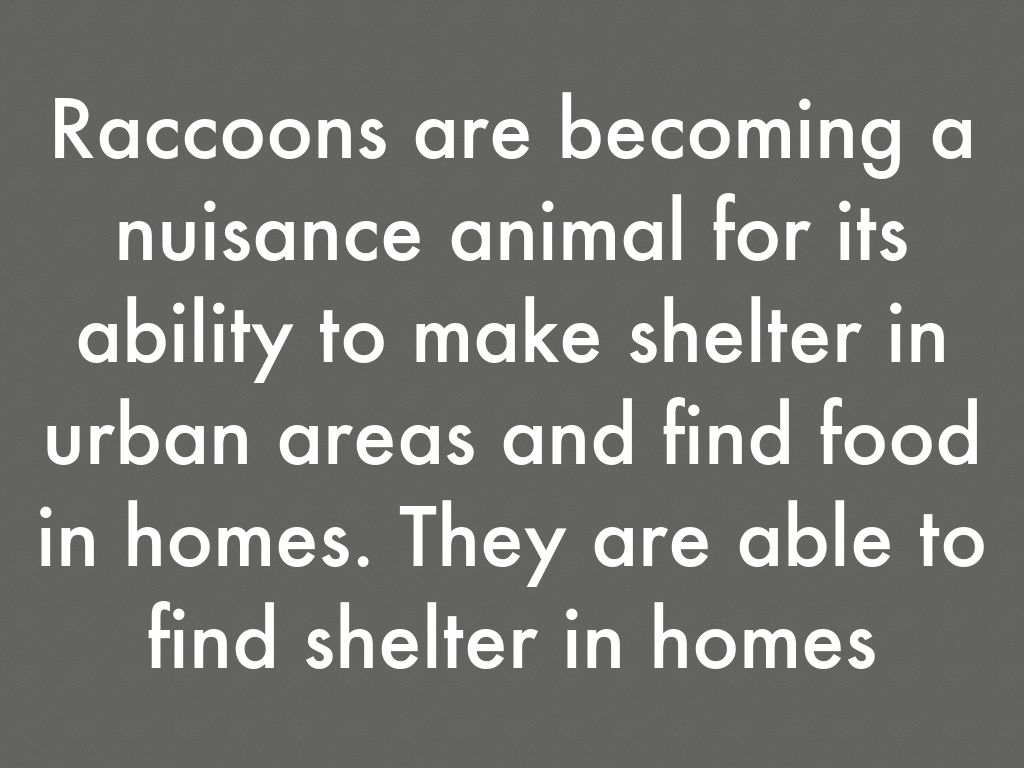 Raccoons are becoming a nuisance animal for its ability to make shelter in urban areas and find food in homes. They are able to find shelter in homes