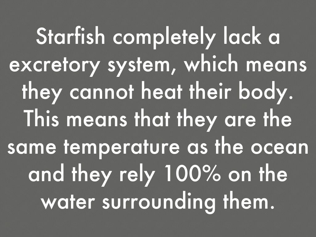 Starfish completely lack a excretory system, which means they cannot heat their body. This means that they are the same temperature as the ocean and they rely 100% on the water surrounding them.