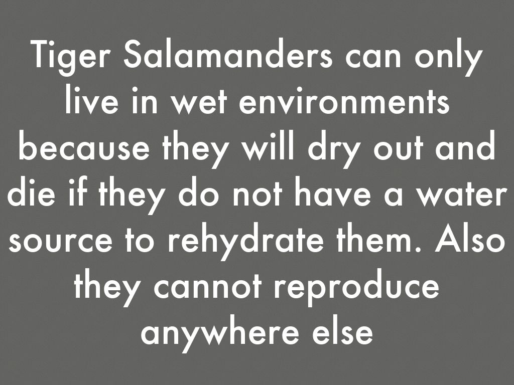 Tiger Salamanders can only live in wet environments because they will dry out and die if they do not have a water source to rehydrate them. Also they cannot reproduce anywhere else