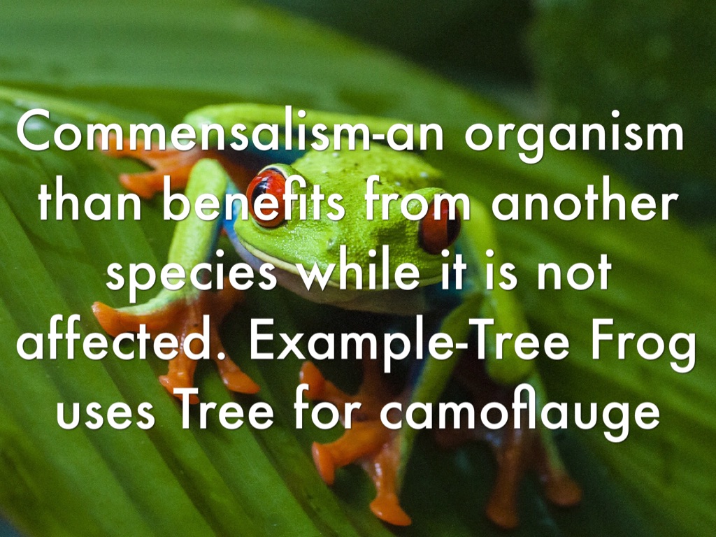Commensalism-an organism than benefits from another species while it is not affected. Example-Tree Frog uses Tree for camoflauge