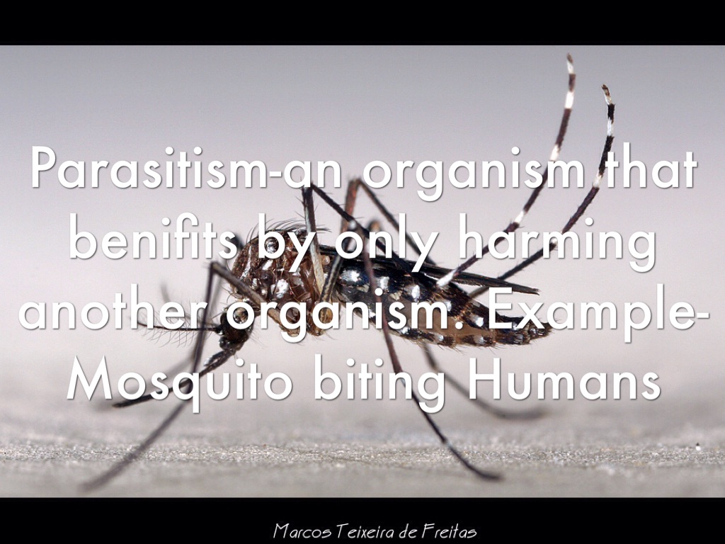 Parasitism-an organism that benifits by only harming another organism. Example-Mosquito biting Humans
