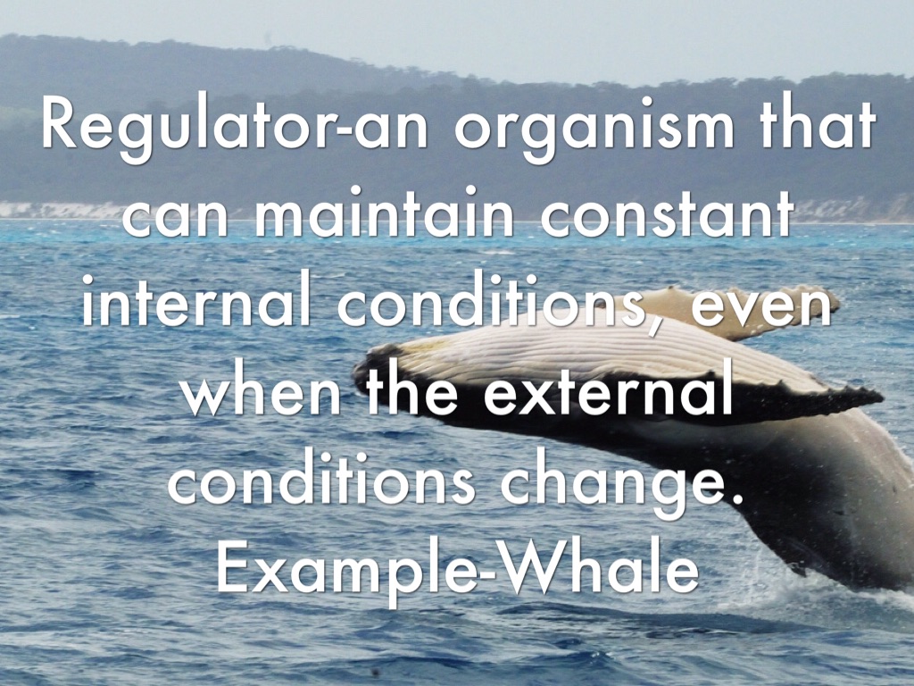 Regulator-an organism that can maintain constant internal conditions, even when the external conditions change. Example-Whale