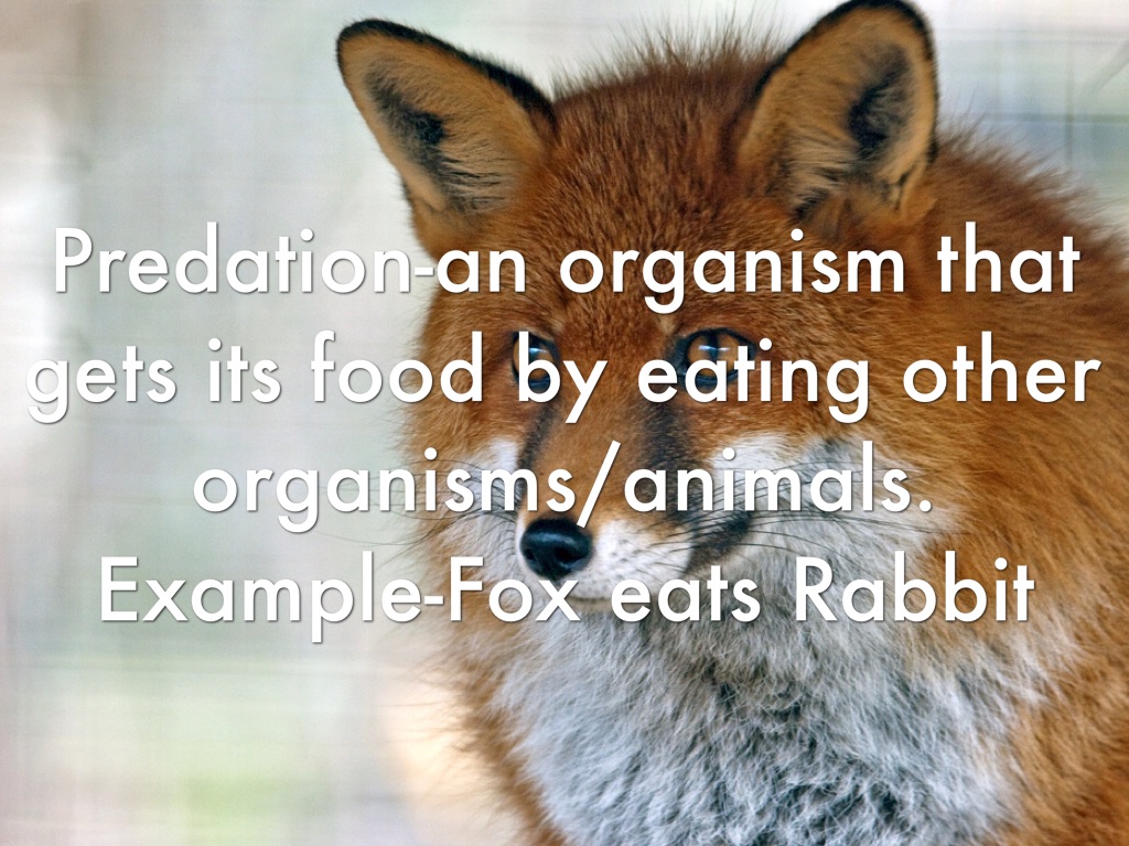 Predation-an organism that gets its food by eating other organisms/animals. Example-Fox eats Rabbit