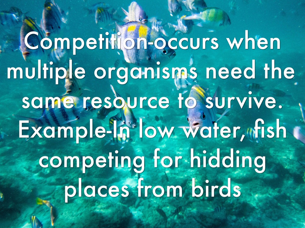 Competition-occurs when multiple organisms need the same resource to survive. Example-In low water, fish competing for hidding places from birds