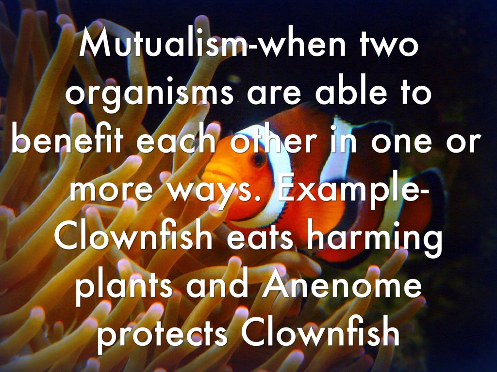 Mutualism-when two organisms are able to benefit each other in one or more ways. Example-Clownfish eats harming plants and Anenome protects Clownfish
