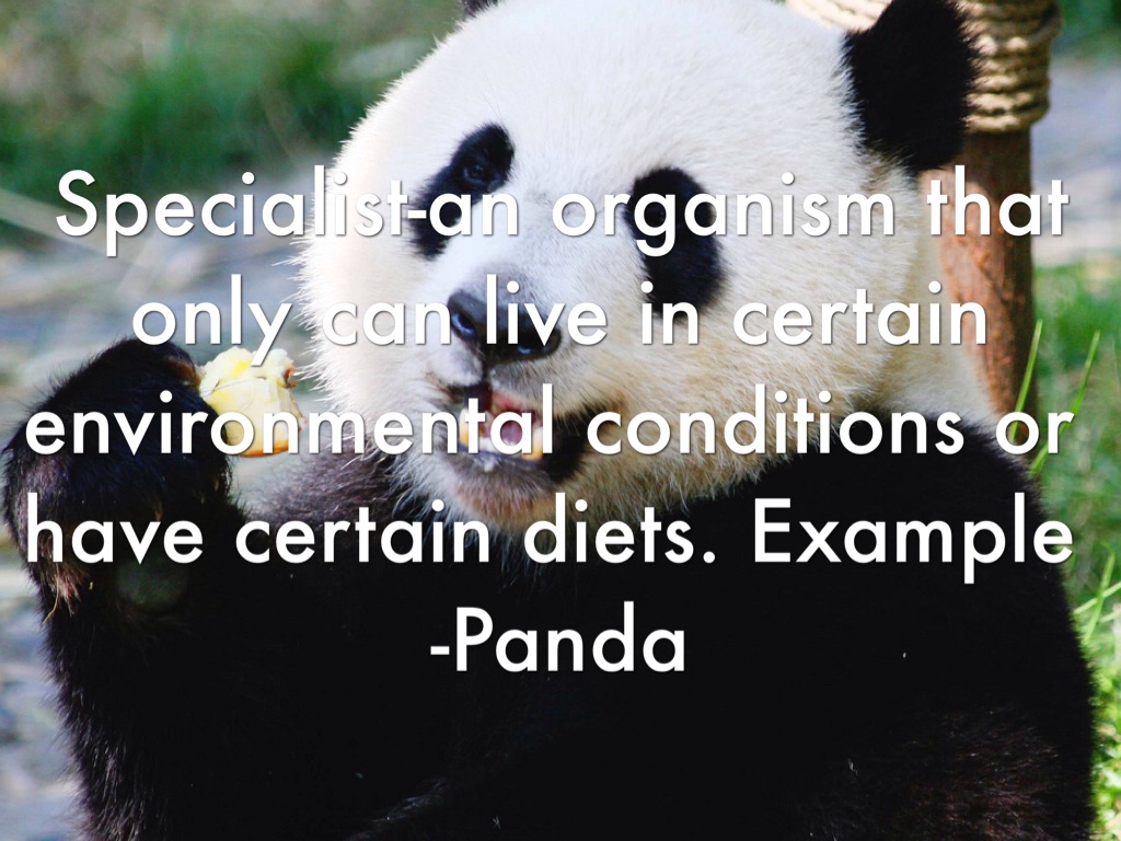 Specialist-an organism that only can live in certain environmental conditions or have certain diets. Example -Panda
