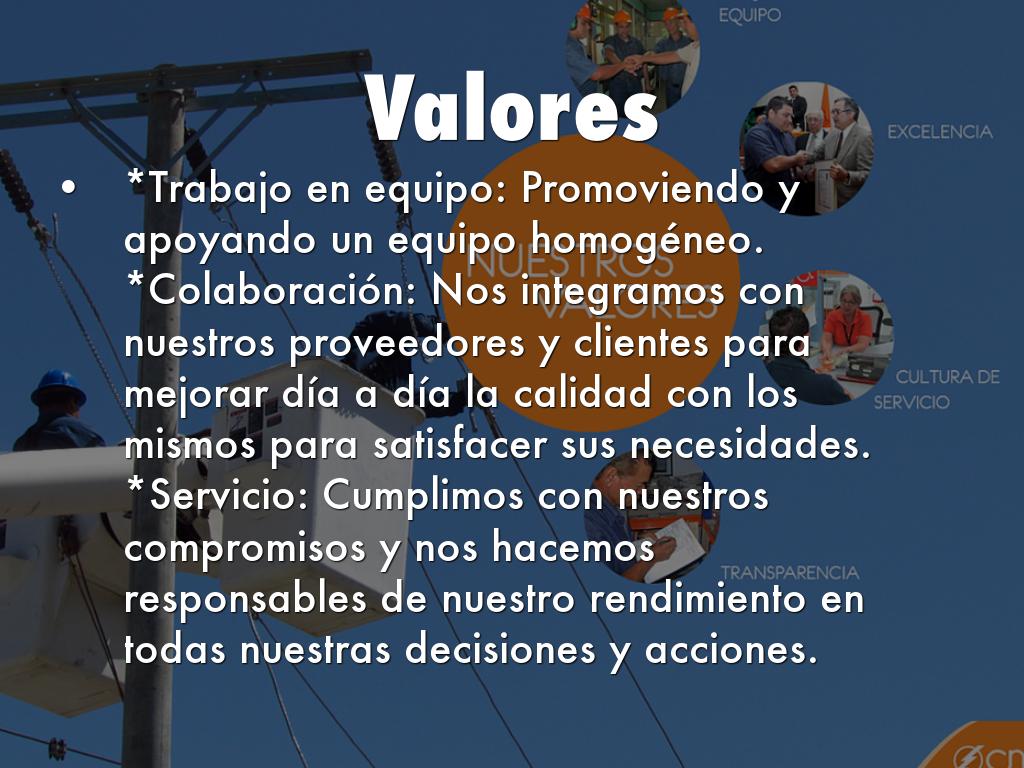 • *Trabajo en equipo: Promoviendo y apoyando un equipo homogéneo. *Colaboración: Nos integramos con nuestros proveedores y clientes para mejorar día a día la calidad con los mismos para satisfacer sus necesidades. *Servicio: Cumplimos con nuestros compromisos y nos hacemos responsables de nuestro rendimiento en todas nuestras decisiones y acciones.