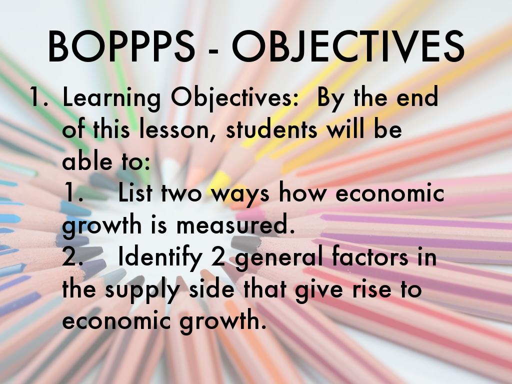 Learning Objectives: By the end of this lesson, students will be able to: 1. List two ways how economic growth is measured. 2. Identify 2 general factors in the supply side that give rise to economic growth.