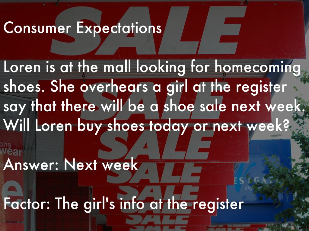 Loren is at the mall looking for homecoming shoes. She overhears a girl at the register say that there will be a shoe sale next week. Will Loren buy shoes today or next week?