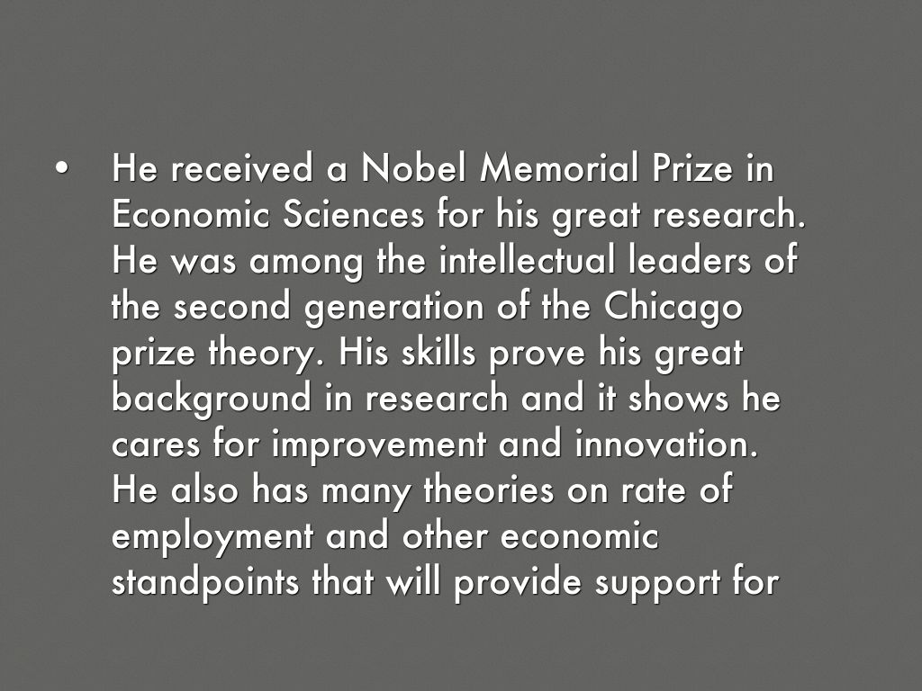 • He received a Nobel Memorial Prize in Economic Sciences for his great research. He was among the intellectual leaders of the second generation of the Chicago prize theory. His skills prove his great background in research and it shows he cares for improvement and innovation. He also has many theories on rate of employment and other economic standpoints that will provide support for the island.