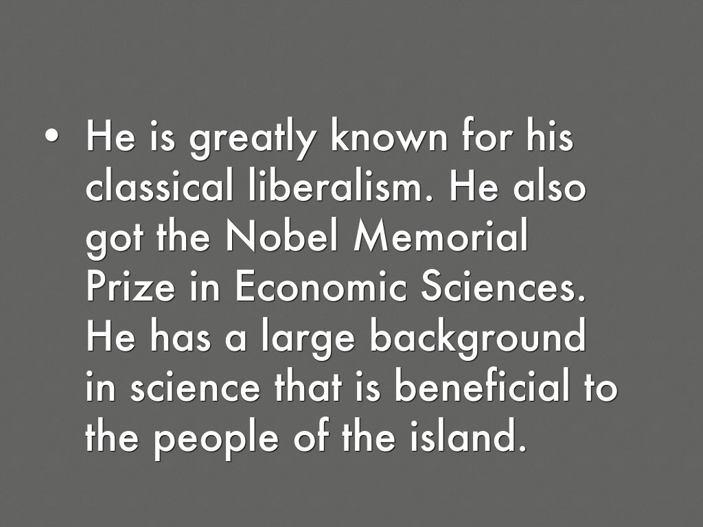 • He is greatly known for his classical liberalism. He also got the Nobel Memorial Prize in Economic Sciences. He has a large background in science that is beneficial to the people of the island.