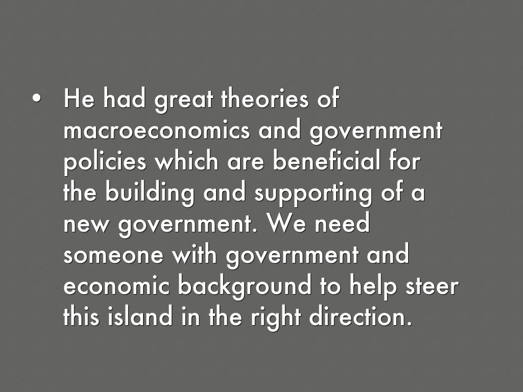 • He had great theories of macroeconomics and government policies which are beneficial for the building and supporting of a new government. We need someone with government and economic background to help steer this island in the right direction.