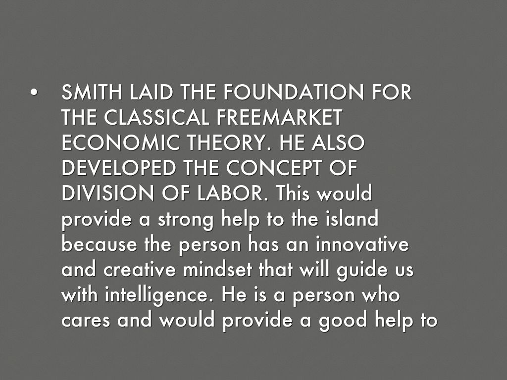 • SMITH LAID THE FOUNDATION FOR THE CLASSICAL FREEMARKET ECONOMIC THEORY. HE ALSO DEVELOPED THE CONCEPT OF DIVISION OF LABOR. This would provide a strong help to the island because the person has an innovative and creative mindset that will guide us with intelligence. He is a person who cares and would provide a good help to the island with his entrepreneurial ideas.