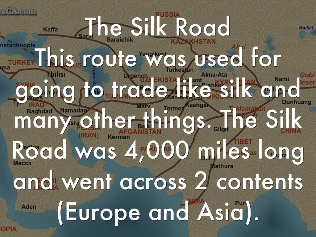 This route was used for going to trade like silk and many other things. The Silk Road was 4,000 miles long and went across 2 contents (Europe and Asia).