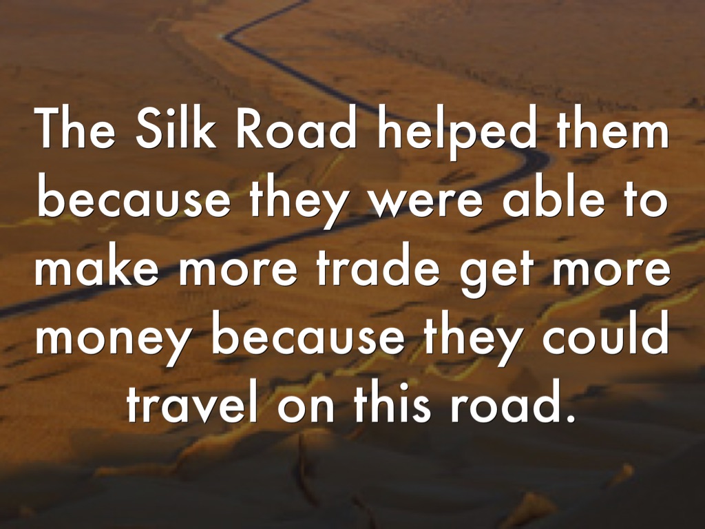 The Silk Road helped them because they were able to make more trade get more money because they could travel on this road.