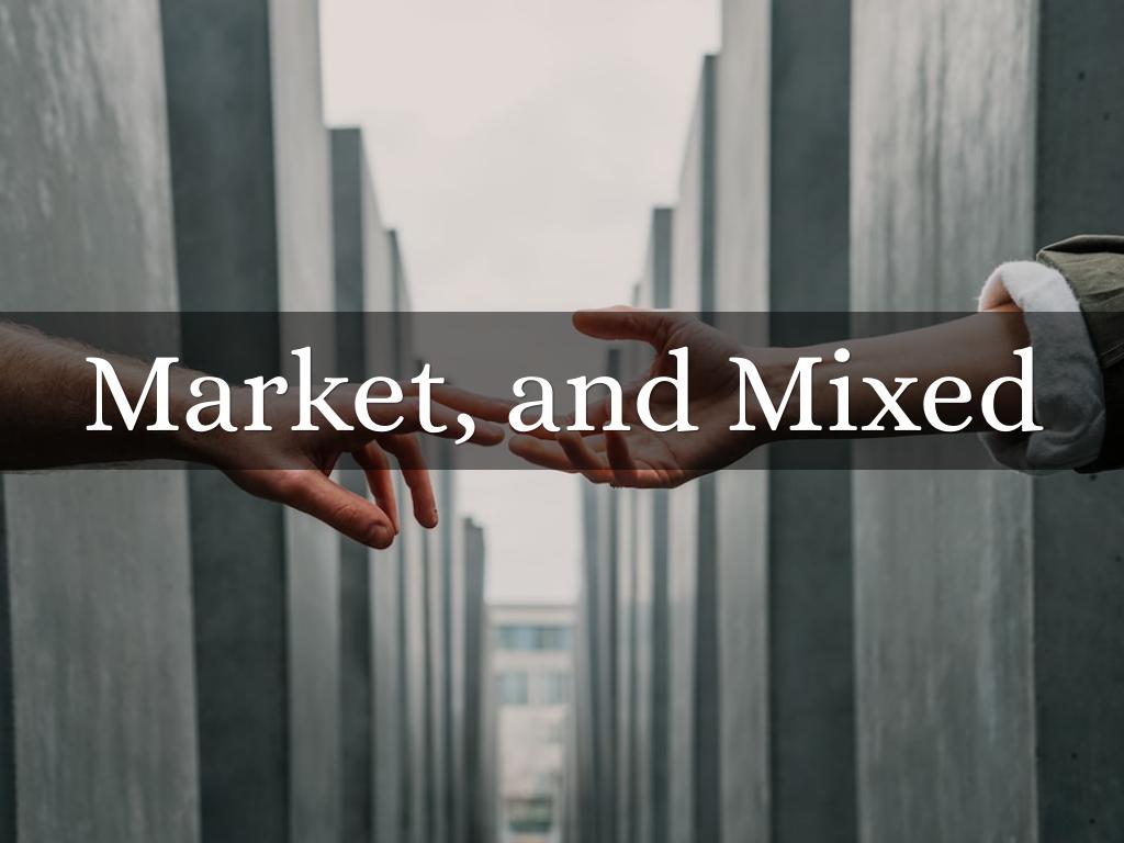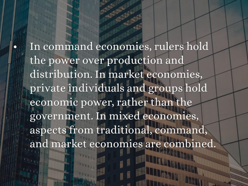 In command economies, rulers hold the power over production and distribution. In market economies, private individuals and groups hold economic power, rather than the government. In mixed economies, aspects from traditional, command, and market economies are combined.