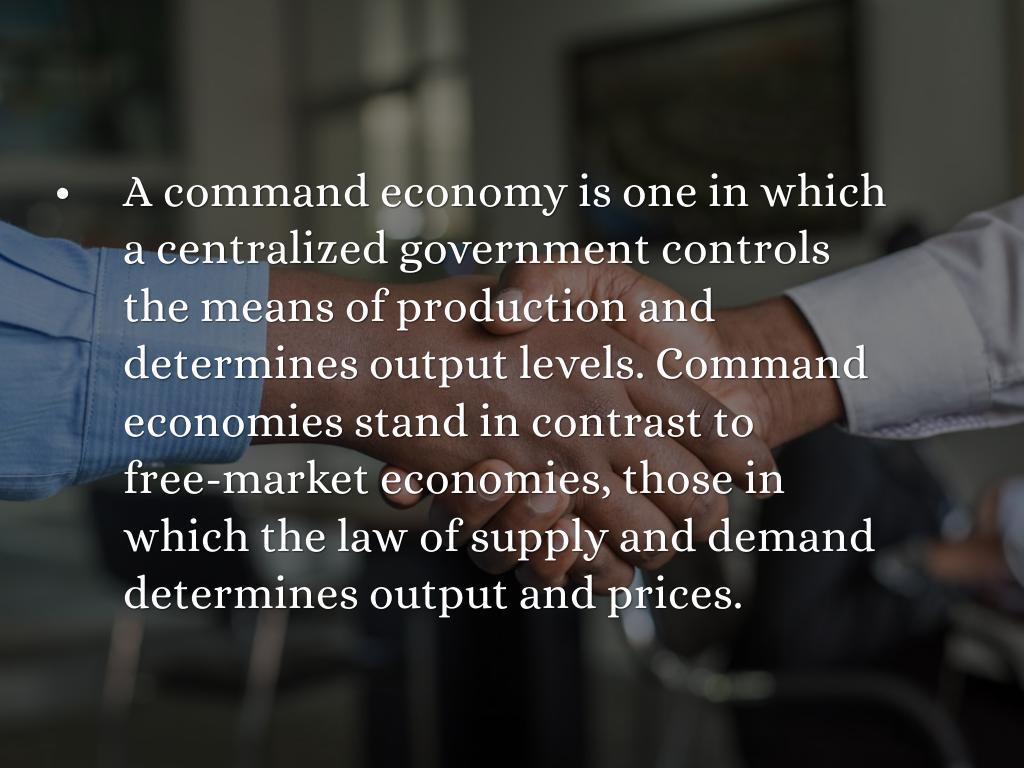 A command economy is one in which a centralized government controls the means of production and determines output levels. Command economies stand in contrast to free-market economies, those in which the law of supply and demand determines output and prices.