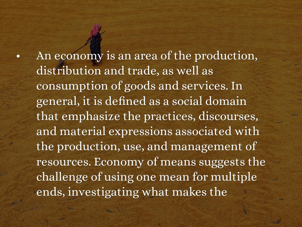 An economy is an area of the production, distribution and trade, as well as consumption of goods and services. In general, it is defined as a social domain that emphasize the practices, discourses, and material expressions associated with the production, use, and management of resources. Economy of means suggests the challenge of using one mean for multiple ends, investigating what makes the category both a mark and a precondition of a rational architecture.
