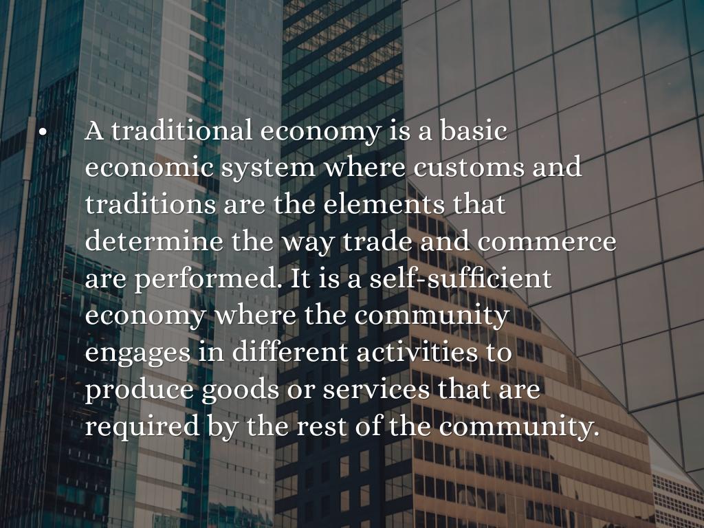 A traditional economy is a basic economic system where customs and traditions are the elements that determine the way trade and commerce are performed. It is a self-sufficient economy where the community engages in different activities to produce goods or services that are required by the rest of the community.