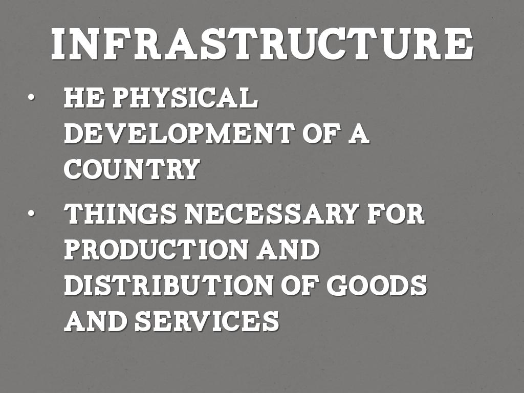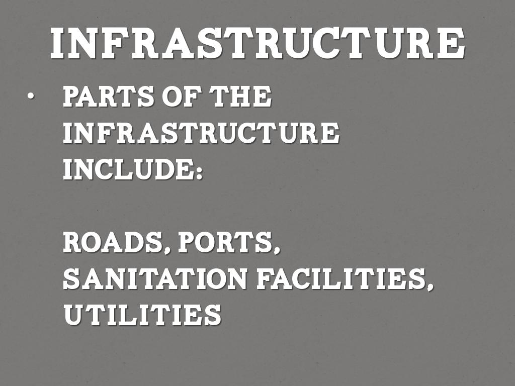 Parts of the infrastructure include: Roads, Ports, Sanitation Facilities, Utilities