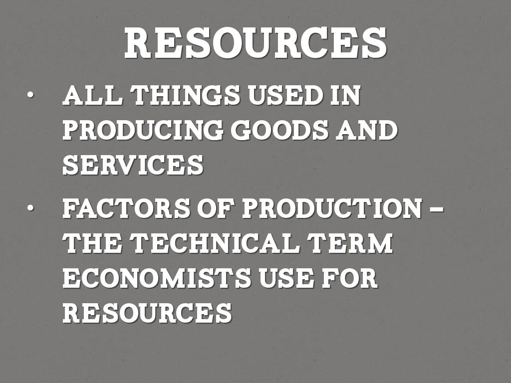 Resources Include: Everything contained in the earth or found in the sea Coal and crude oil are examples A lake and all the living things in the lake are also examples