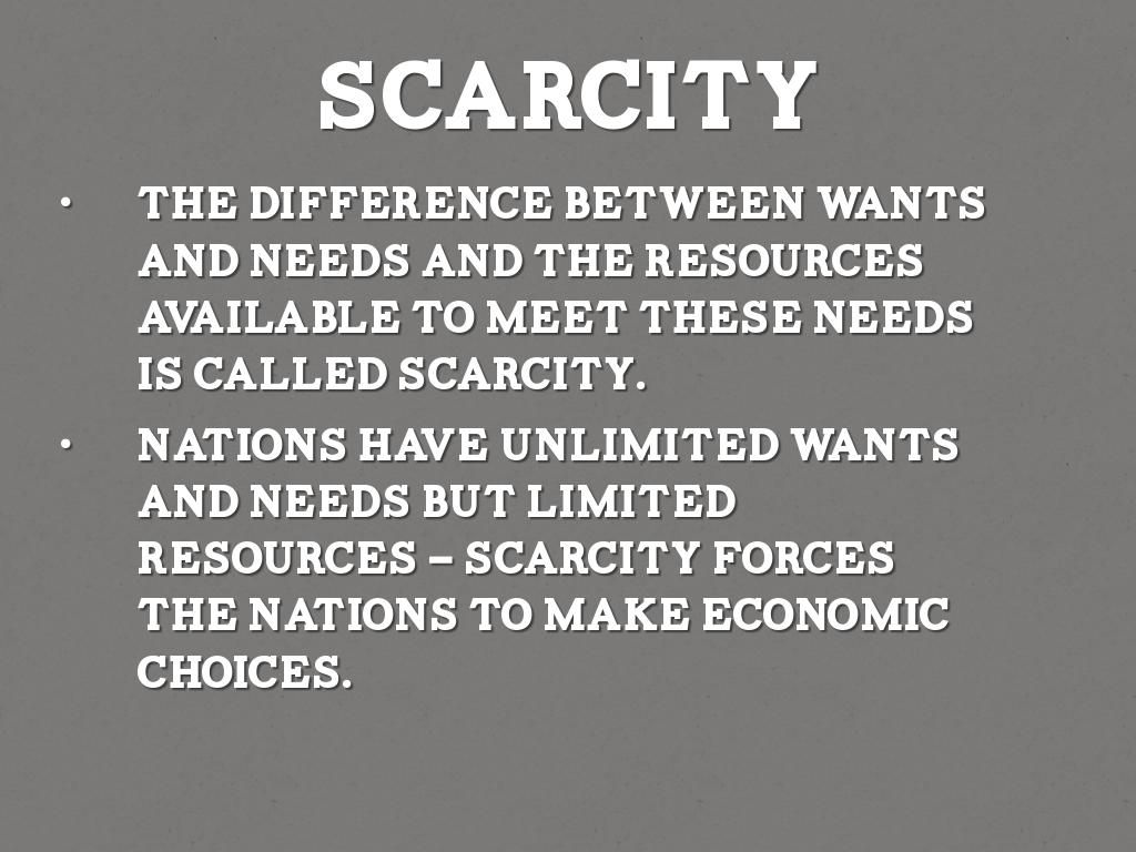 Nations have unlimited wants and needs but limited resources – Scarcity forces the nations to make economic choices.