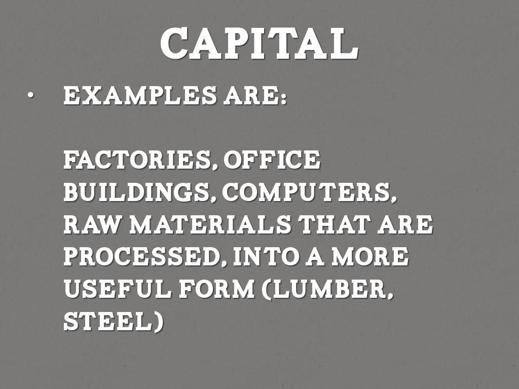 Examples are: Factories, Office Buildings, Computers, Raw materials that are processed, into a more useful form (lumber, steel)