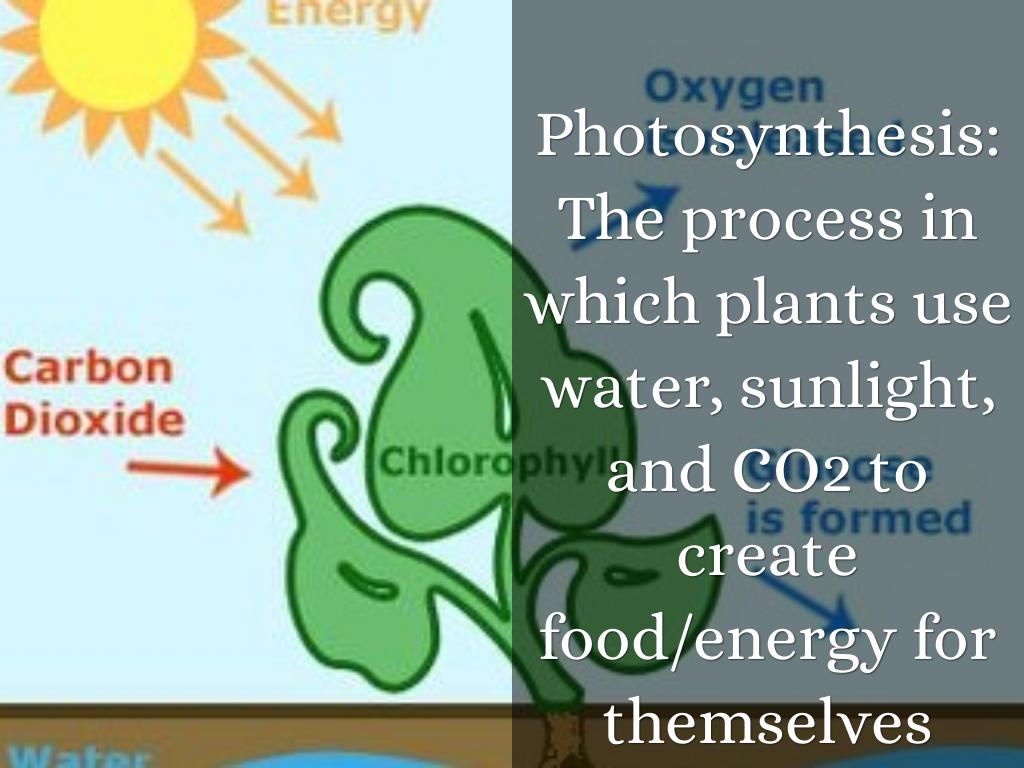 The process in which plants use water, sunlight, and CO2 to create food/energy for themselves