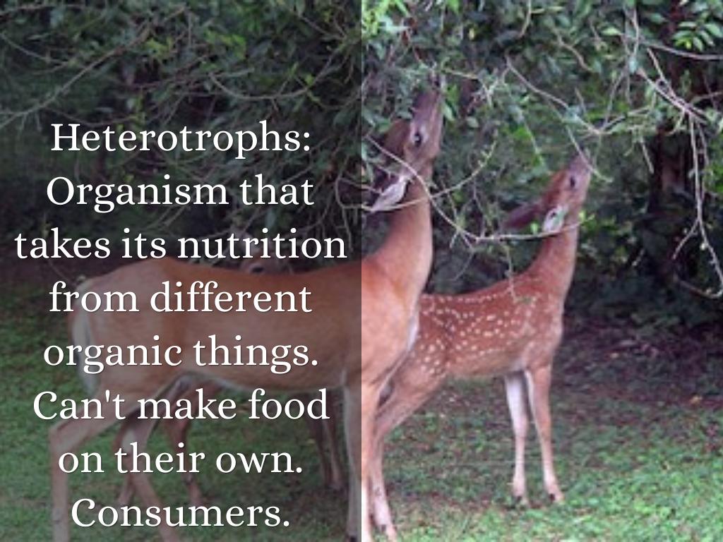 Organism that takes its nutrition from different organic things. Can't make food on their own. Consumers.