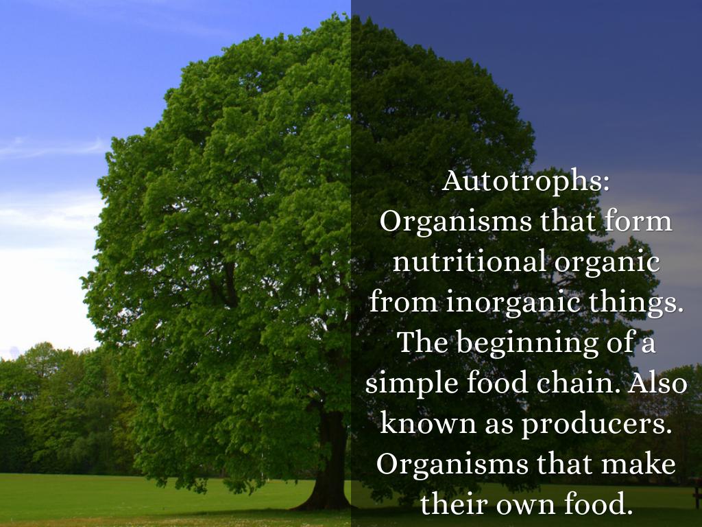 Organisms that form nutritional organic from inorganic things. The beginning of a simple food chain. Also known as producers. Organisms that make their own food.