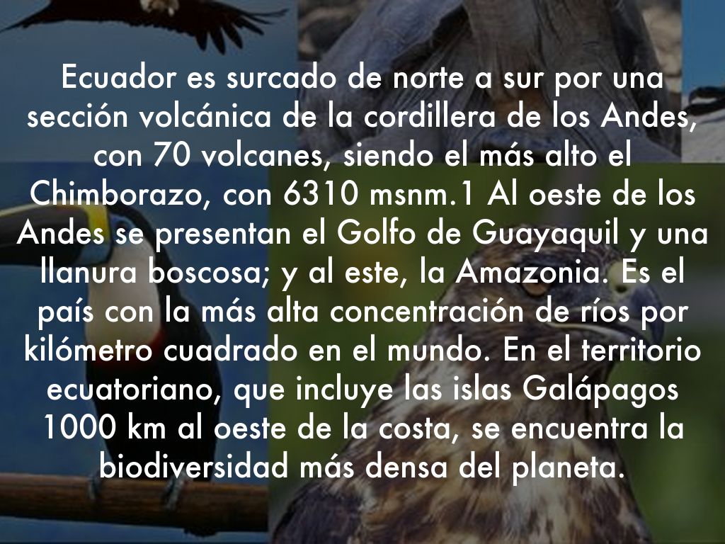 Ecuador es surcado de norte a sur por una sección volcánica de la cordillera de los Andes, con 70 volcanes, siendo el más alto el Chimborazo, con 6310 msnm.1 Al oeste de los Andes se presentan el Golfo de Guayaquil y una llanura boscosa; y al este, la Amazonia. Es el país con la más alta concentración de ríos por kilómetro cuadrado en el mundo. En el territorio ecuatoriano, que incluye las islas Galápagos 1000 km al oeste de la costa, se encuentra la biodiversidad más densa del planeta.