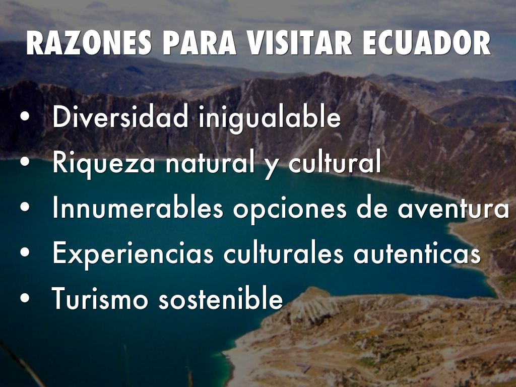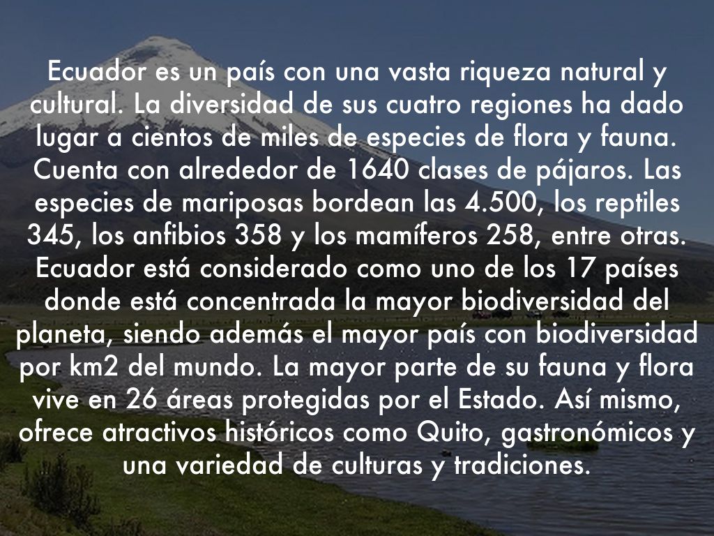Ecuador es un país con una vasta riqueza natural y cultural. La diversidad de sus cuatro regiones ha dado lugar a cientos de miles de especies de flora y fauna. Cuenta con alrededor de 1640 clases de pájaros. Las especies de mariposas bordean las 4.500, los reptiles 345, los anfibios 358 y los mamíferos 258, entre otras. Ecuador está considerado como uno de los 17 países donde está concentrada la mayor biodiversidad del planeta, siendo además el mayor país con biodiversidad por km2 del mundo. La mayor parte de su fauna y flora vive en 26 áreas protegidas por el Estado. Así mismo, ofrece atractivos históricos como Quito, gastronómicos y una variedad de culturas y tradiciones.