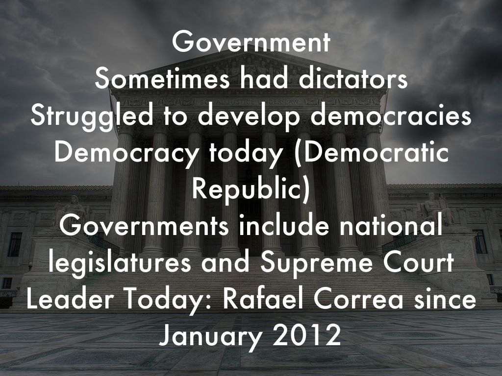 Government Sometimes had dictators Struggled to develop democracies Democracy today (Democratic Republic) Governments include national legislatures and Supreme Court Leader Today: Rafael Correa since January 2012
