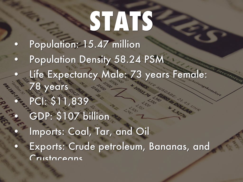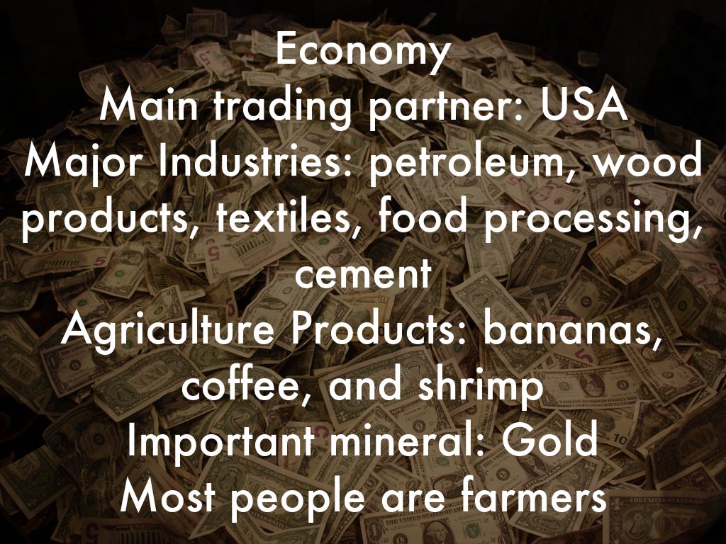 Economy Main trading partner: USA Major Industries: petroleum, wood products, textiles, food processing, cement Agriculture Products: bananas, coffee, and shrimp Important mineral: Gold Most people are farmers
