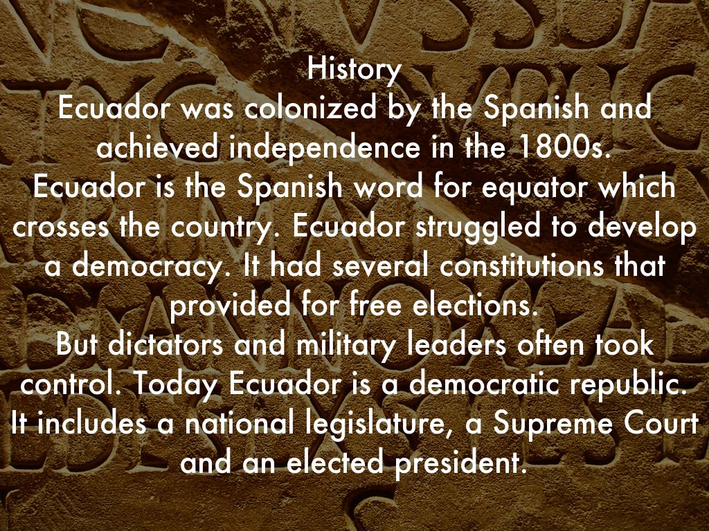 History Ecuador was colonized by the Spanish and achieved independence in the 1800s. Ecuador is the Spanish word for equator which crosses the country. Ecuador struggled to develop a democracy. It had several constitutions that provided for free elections. But dictators and military leaders often took control. Today Ecuador is a democratic republic. It includes a national legislature, a Supreme Court and an elected president.